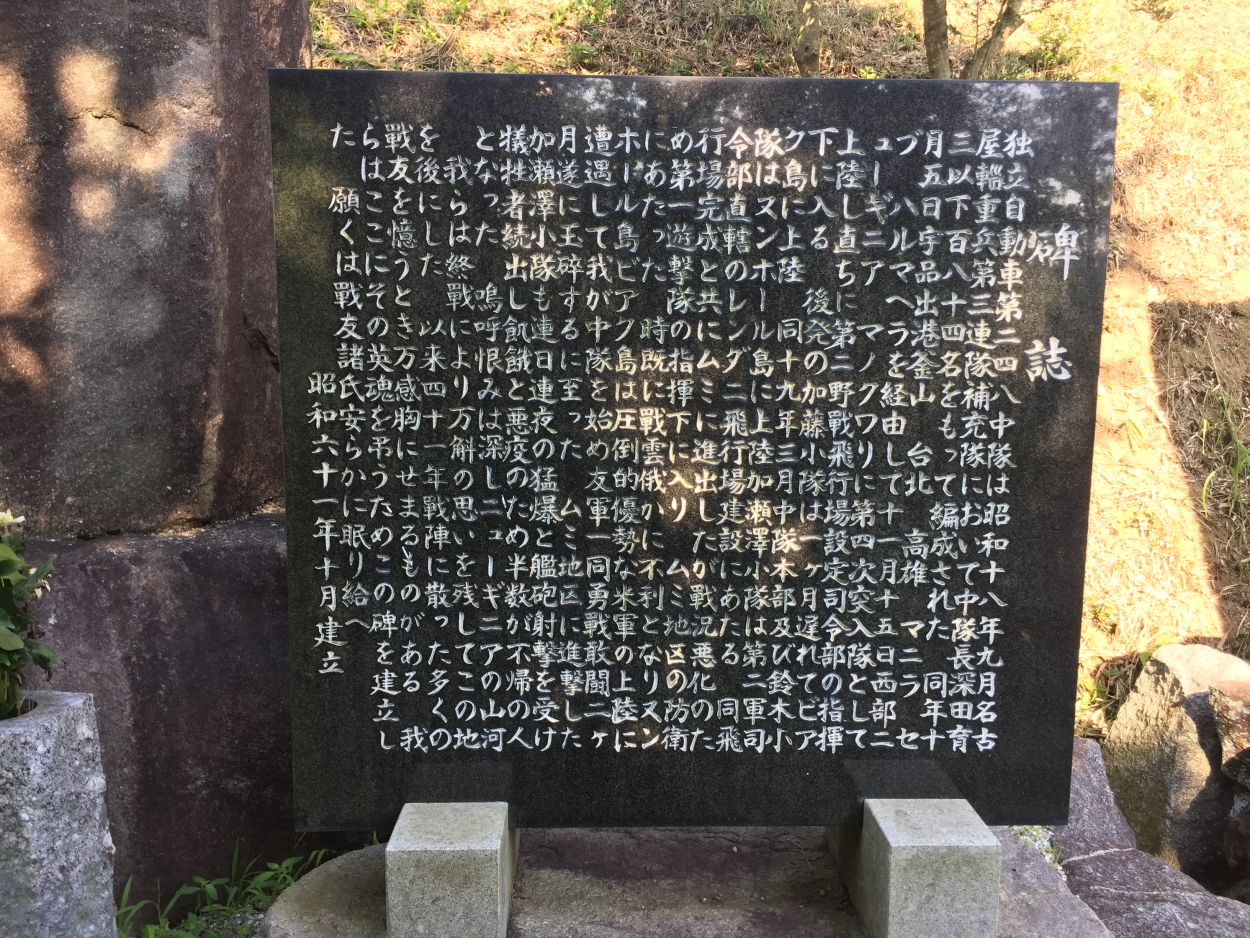 我らは終戦に依り万斛(ばんこく)の思いを残してこの地を後にした 以来四十一年戦陣に散った多くの戦友を憶うとき万感胸にせまるものがある 我らはここにその英魂を弔うためにこの碑を建立した 願くは戦友諸氏安らかに眠り給へ
