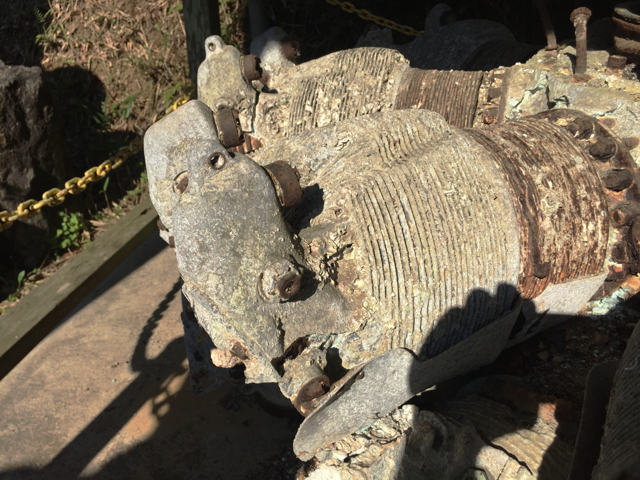 海中に長らく沈んでいたので、フジ壷やらなんやらで石化してる。プッシュロッドは無くなりロッカーアームカバーもボロボロになっている。細かいアルミのフィンは美しい。