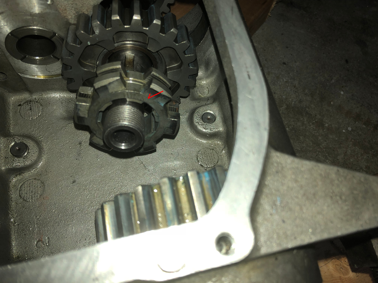 カウンターシャフトのスラストワッシャはカウンターの1STギアに対してこのように取り付く。穴がメタルブッシュの位置に来ているのがわかる。