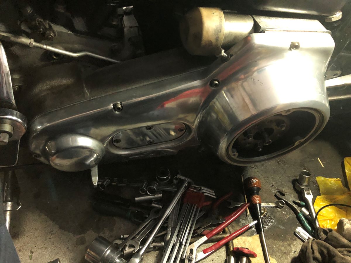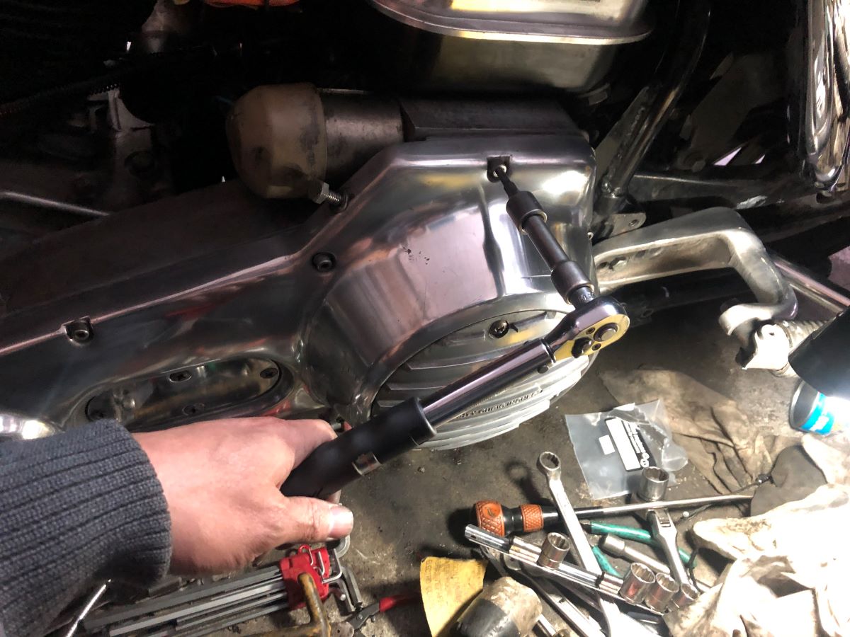 ボルトは軽く締め付けておく。クラッチ調整で何かあって外さないといけないとガスケットもったいないので締め付けないでおく。ついでなので、プライマリーケースを磨いておいた