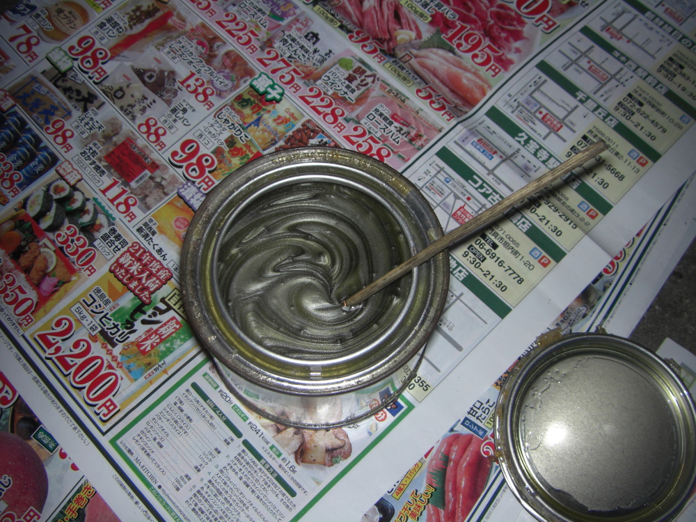 POR-15は分離しているから、使うときはしっかり撹拌して混ぜるよう。銀色になるまで混ぜましょう。