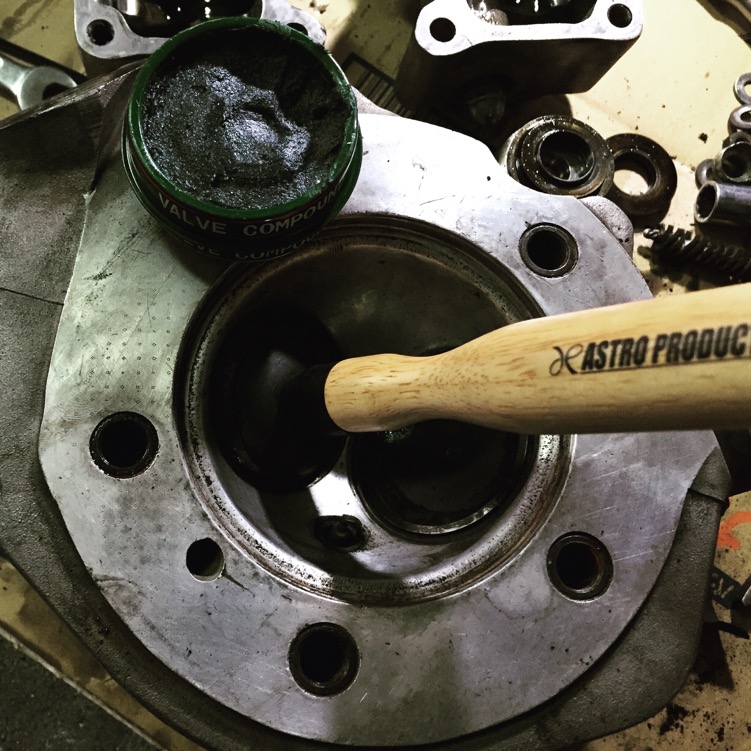 吸気側、排気側ともどもバルブSP、シールを外したらバルブの摺り合わせ。タコ棒をバルブに付けて、バルブとシートの接触面にバルブコンパウンド粗目を付け、ひたすら叩きつける。ガイドにはCRCを吹いてすべりやすくしておく。