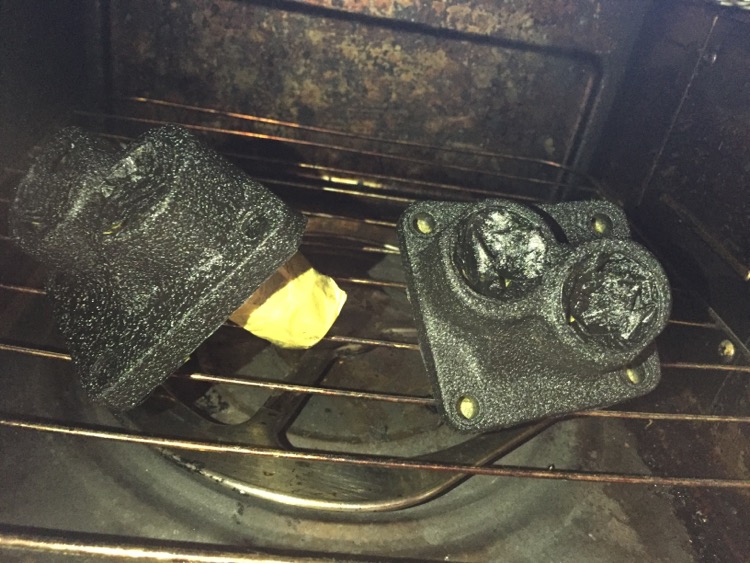 貧乏性なので使わなくなったものをとっておくクセがある。使わなくなったオーブンレンジが役に立った。250度で予熱しておいて150度10分くらいタペットブロックを加熱した。