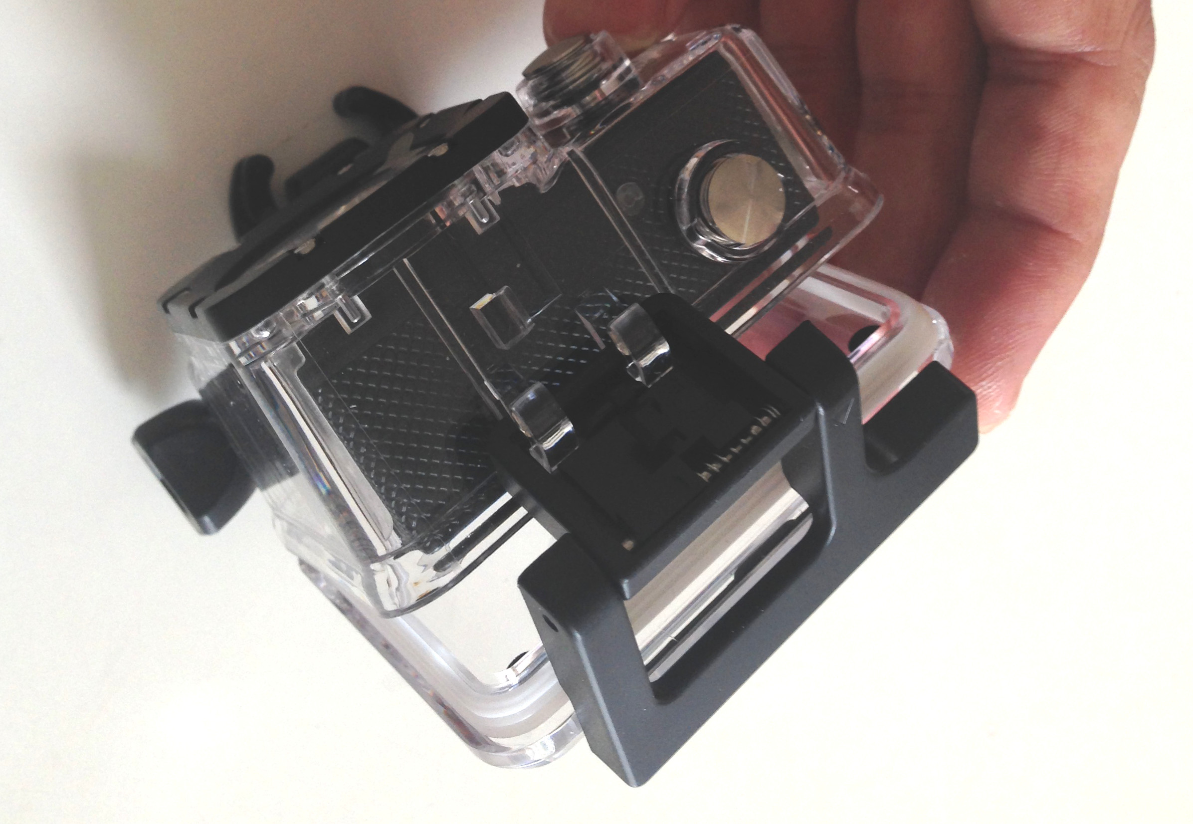 マウント用の取付け部品は付属している。これのネジ部に上のマウントキット取り付ければいいみたい。防水ケースを外すからUSBに接続しながら撮影できる。